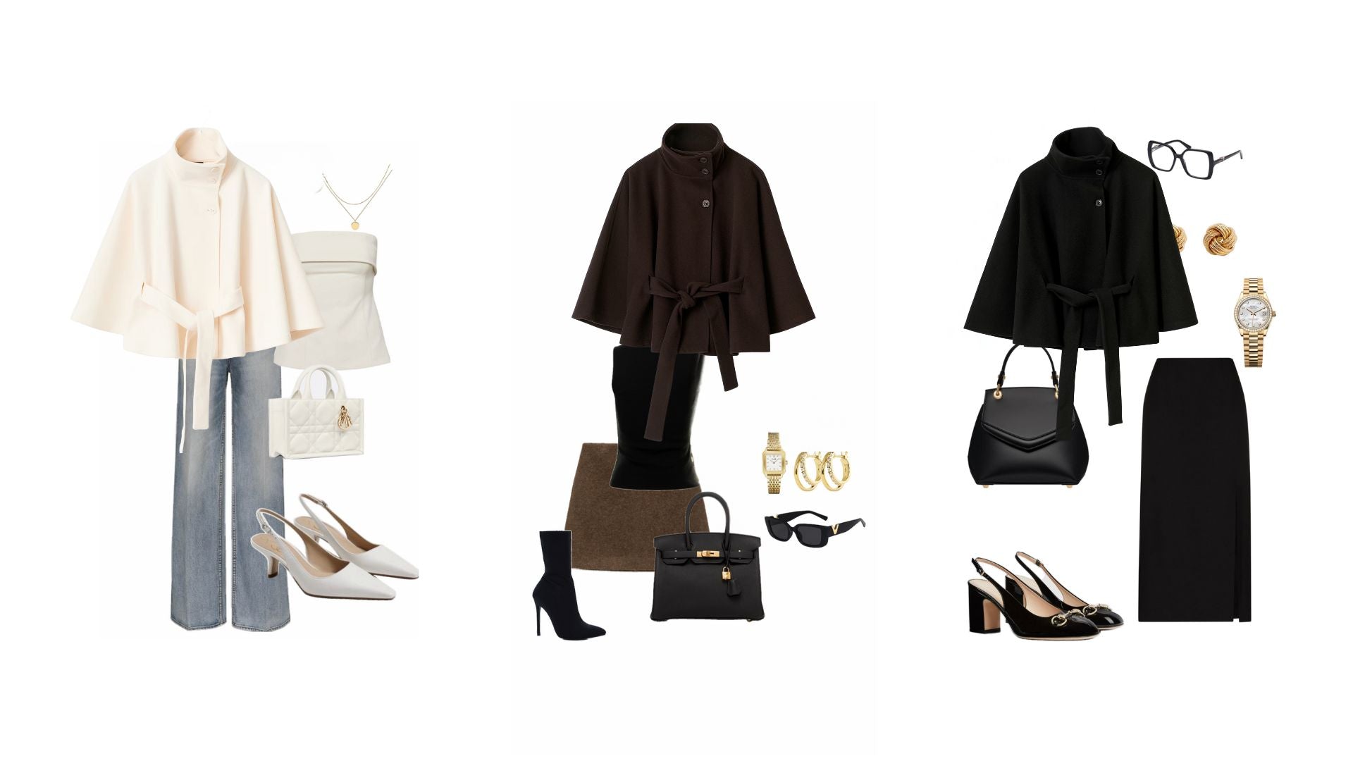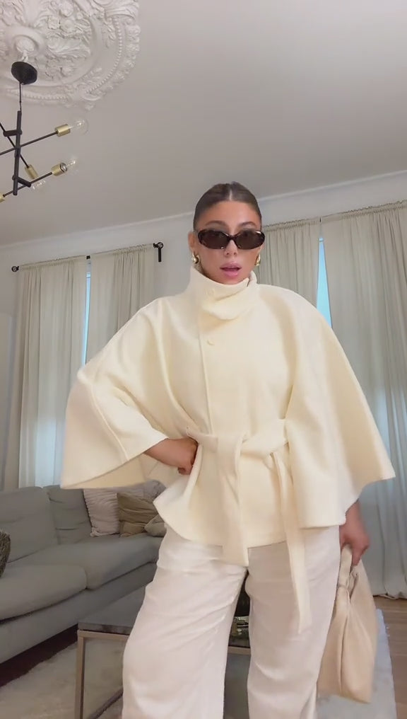 Elegant and effortlessly chic, this cape-style belted jacket combines timeless design with modern sophistication. Crafted from soft, structured fabric (polyester), it drapes beautifully over the shoulders while the matching waist belt accentuates the silhouette. Featuring a high stand-up collar with button details, it’s perfect for layering on cooler days - a refined piece that elevates any outfit with ease.